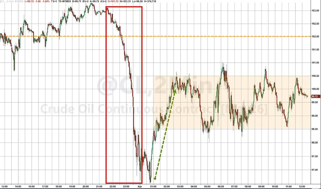 但油价的每一次下跌,都伴随着反弹。据数据梳理,4月1日全天,油价随着特朗普与伊朗之间的消息来回剧烈震荡: