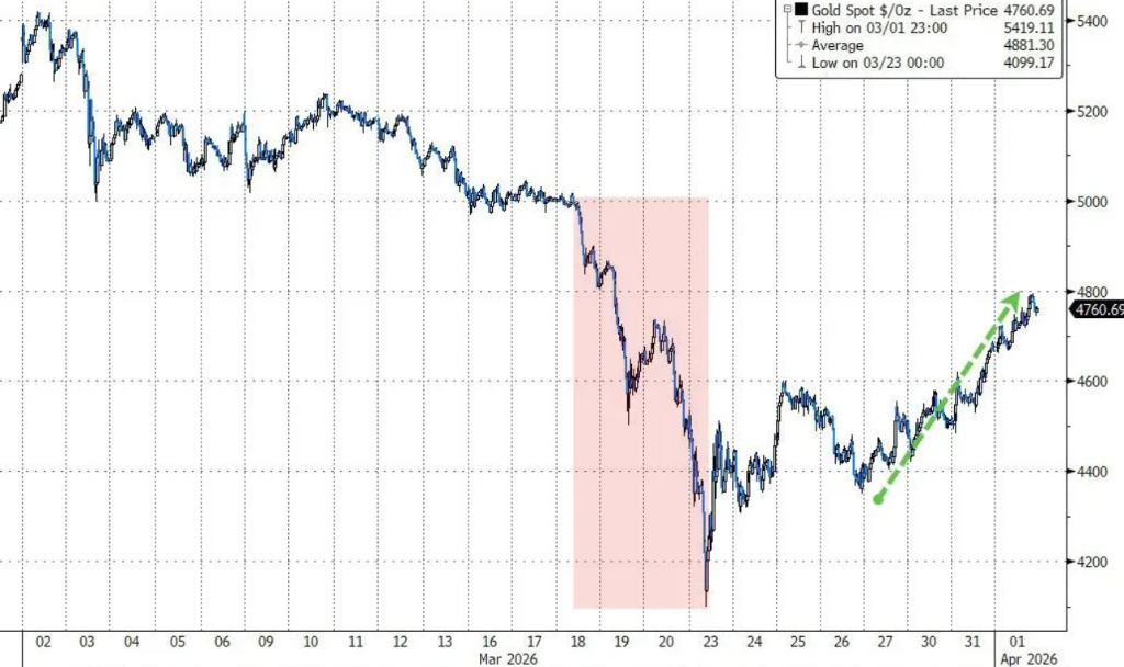 值得注意的是,黄金3月曾下跌近12%,创下2008年10月以来最差单月表现。彼时,高油价推升通胀预期,压低了降息预期,黄金的避险属性反而失效。如今随着停火预期升温,这一逻辑正在逆转。