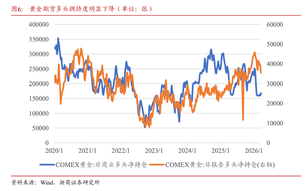 此外,持仓结构的改善也为黄金回归基本面定价提供了条件。目前COMEX黄金非商业多头净持仓及散户持仓均已较前期显著回落,此前压制黄金的资金面扰动正趋于尾声。