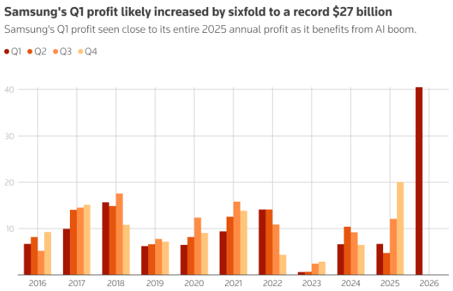 受益于人工智能热潮推动的芯片价格飙升,三星电子第一季度营业利润可能将增长六倍,创下季度新高,并接近其上一财年全年利润。LSEG的数据显示,分析师预测,受存储芯片“前所未有的超级周期”的提振,三星预计将于下周二公布营收增长50%,利润达到40.5万亿韩元(约合269亿美元)。
