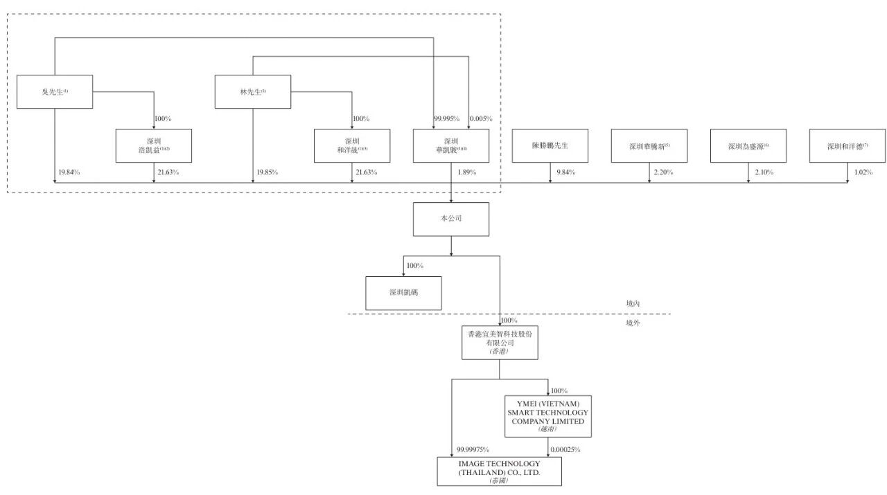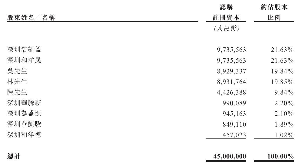 IPO前,深圳浩凯益、深圳和洋晟分别持股为21.63%,吴林佺持股为19.84%,林咏华持股为19.85%,陈胜鹏持股为9.84%;