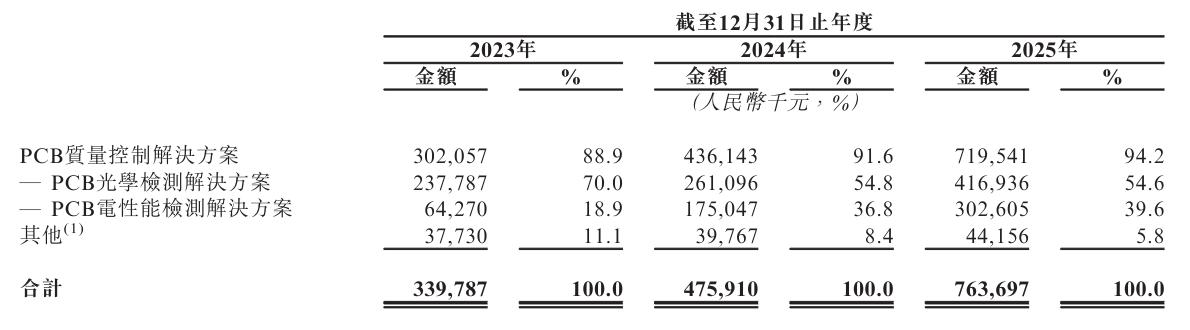 宜美智科2025年来自PCB光学检测解决方案收入为4.17亿元,占比为54.6%;来自PCB电性能检测解决方案收入为3亿元,占比为39.6%。