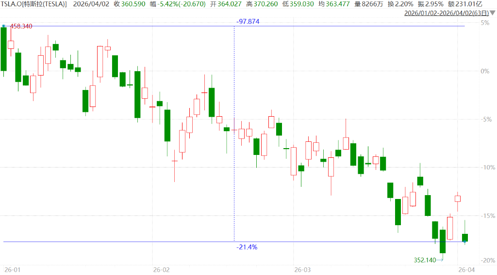 交付数据发布后,特斯拉美股价格跌超5%,进一步拖累今年以来的累计跌幅。