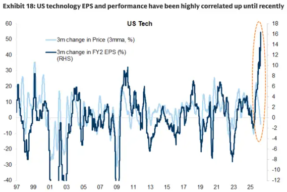 7、最后,尽管最近出现了抛售,但科技股2026年和2027年分析师盈利预期正面修正的净百分比仍然超过了其他所有行业。