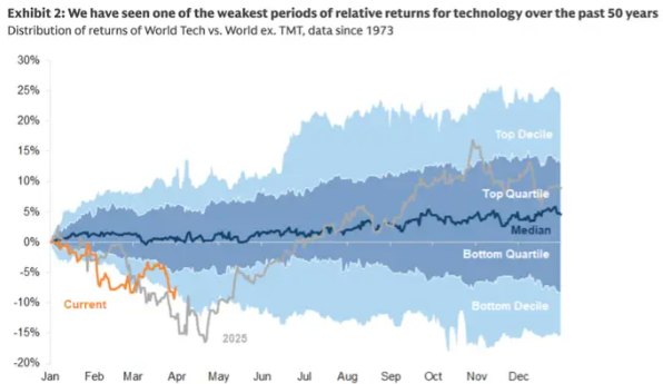 该公司全球投资策略团队表示,尽管估值、资本支出和人工智能带来的颠覆性影响令人担忧,但信息技术行业的基本面依然强劲。他们以第四季度两位数的盈利增长为例。策略师们还指出,自美伊战争爆发以来,信息技术行业的表现优于标普500 指数,凸显了该行业的长期增长和质量特点。
