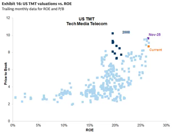 6、其次,虽然美国科技、媒体和电信(TMT)股票的市净率(PB)较高,但它们的净资产收益率(ROE)也很高,这表明其处于历史合理且符合趋势的水平。净资产收益率指的是公司利润与其市值之比。高盛表示,这应该可以缓解人们对人工智能基础设施过度支出的担忧。相比之下,在互联网泡沫鼎盛时期,ROE与PB并不匹配。