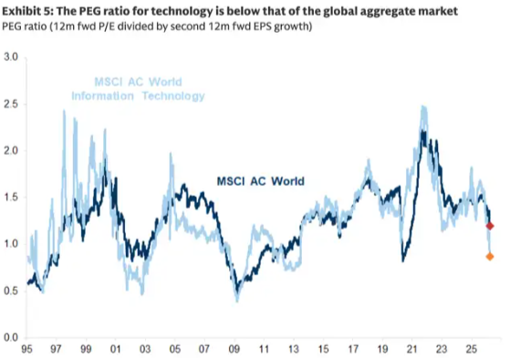 2、其次,全球科技行业的远期PEG比率目前已远低于全球整体市场水平。PEG比率(市盈率增长比率)衡量的是未来12个月的预期盈利与之后12个月的预期盈利增长率。科技行业的远期PEG比率已跌破1,这意味着该行业被低估。