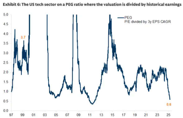 3、科技股的滚动PEG比率也处于低估区域。该指标通过比较过去12个月的盈利与过去三年的盈利增长率,消除了不确定成分。该银行表示:“科技股‘回顾性’PEG的崩盘意味着未来收益将大幅下降,并已降至2003-05年科技泡沫破裂后的谷底水平。”