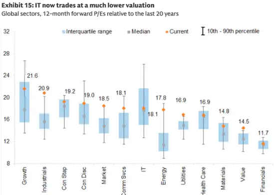 5、按同样的估值标准衡量,全球科技股目前的交易价格几乎与其20年来的中位数持平。只有金融板块的交易价格与其历史水平相近,而其他所有板块的估值都高于历史平均水平。