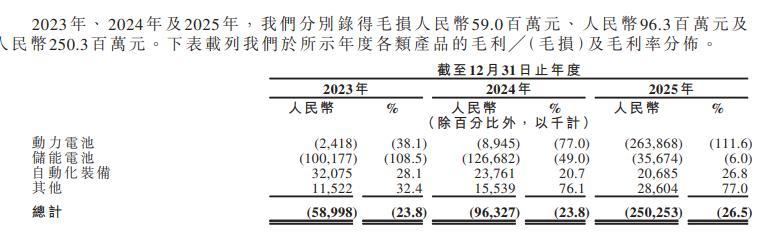 综合毛利率同样表现不佳,2023年至2025年分别为-23.77%、-23.76%、-26.54%,其中动力电池业务表现尤为突出,2025年毛利率低至-111.6%,储能电池业务虽然有所回暖,但毛利率依然是负的。