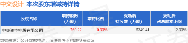 证券之星消息,4月20日中交设计发布公告《中交设计:中交设计关于控股股东全资子公司增持公司股份计划实施期限届满暨实施结果的公告》,其股东中交资本控股有限公司于2025年10月24日至2026年4月20日间合计增持760.22万股,占公司目前总股本的0.3313%,变动期间该股股价下跌12.15%,截止4月20日收盘报6.87元。