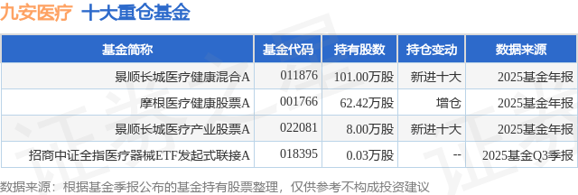 根据2025基金年报公募基金重仓股数据,重仓该股的公募基金共3家,其中持有数量最多的公募基金为景顺长城基金的景顺长城医疗健康混合A。景顺长城医疗健康混合A目前规模为2.92亿元,最新净值0.7785(4月17日),较上一交易日下跌1.28%,近一年上涨22.18%。该公募基金现任基金经理为乔海英。乔海英在任的基金产品包括:景顺长城医疗产业股票A,管理时间为2025年1月24日至今,期间收益率为29.5%。