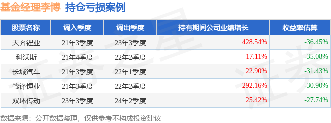 重仓股调仓示例详解:1、赛力斯(601127)翻倍案例:李博管理的信澳博见成长一年定期开放混合A基金在23年3季度买入赛力斯,在持有2年又1个季度后在25年4季度卖出。持有期间的估算收益率为223.81%,持有期间赛力斯在2023年到2025年的年报营业总收入增幅达360.5%。2、赛力斯(601127)调仓案例:李博管理的信澳星奕混合A基金在23年4季度买入赛力斯,在持有2年又0个季度后在25年4季度卖出。持有期间的估算收益率为71.49%,持有期间赛力斯在2023年到2025年的年报营业总收入增幅达360.5%。3、天齐锂业(002466)调仓案例:李博管理的信澳新能源精选混合A基金在21年3季度买入天齐锂业,在持有2年又0个季度后在23年3季度卖出。持有期间的估算收益率为-36.45%,持有期间天齐锂业在2021年到2023年的年报营业总收入增幅达428.54%。