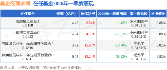 证券之星消息,截止2026年一季度末,基金经理李博旗下共管理4只基金,本季度表现最佳的为信澳博见成长一年定期开放混合A(016810),季度净值跌10.7%。