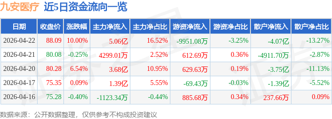 证券之星消息,九安医疗4月22日涨停收盘,收盘价88.09元。该股于14点49分涨停,未打开涨停,截止收盘封单资金为1.03亿元,占其流通市值0.27%。