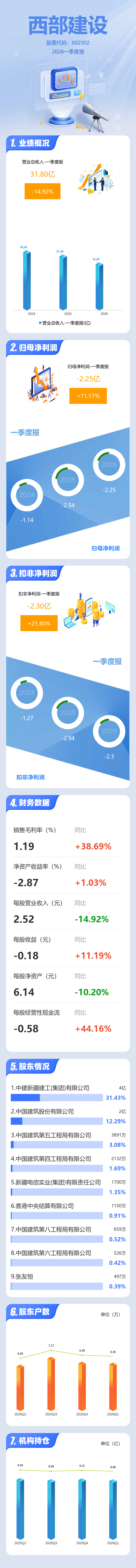 证券之星消息,西部建设2026年一季报显示,一季度公司主营收入31.8亿元,同比下降14.92%;归母净利润-2.25亿元,同比上升11.17%;扣非净利润-2.3亿元,同比上升21.8%;负债率70.8%,投资收益-254.7万元,财务费用3368.46万元,毛利率1.19%。