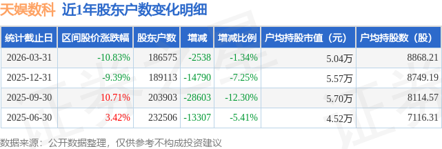 从股价来看,2025年12月31日至2026年3月31日,天娱数科区间跌幅为10.83%,在此期间股东户数减少2538.0户,减幅为1.34%。