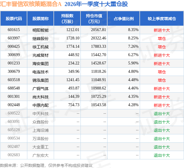 汇丰晋信双核策略混合A的前十大重仓股如下: