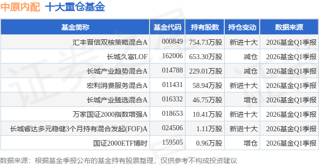 根据2026基金Q1季报公募基金重仓股数据,重仓该股的公募基金共8家,其中持有数量最多的公募基金为汇丰晋信基金的汇丰晋信双核策略混合A。汇丰晋信双核策略混合A目前规模为5.88亿元,最新净值2.036(4月21日),较上一交易日下跌0.08%,近一年上涨54.7%。该公募基金现任基金经理为韦钰。韦钰在任的基金产品包括:汇丰晋信珠三角区域发展混合,管理时间为2026年2月14日至今,期间收益率为-7.46%;汇丰晋信策略优选混合A,管理时间为2026年2月14日至今,期间收益率为-3.87%。
