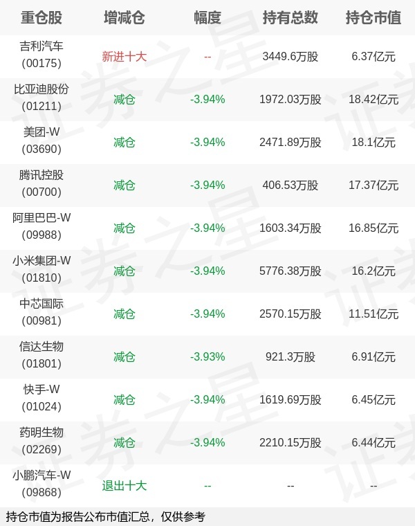证券之星消息,4月22日景顺长城基金旗下金璜 汪洋管理的景顺长城中证港股通科技交易型开放式指数基金公布一季报,近1年净值增长率5.67%。与上一季度相比,该基金前十大重仓股新增吉利汽车;其中比亚迪股份持仓占比9.83%,为该基金第一大重仓股;小鹏汽车-W等退出前十大重仓股;详细数据如下: