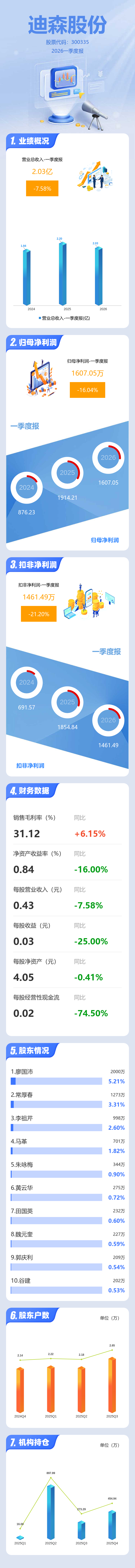 证券之星消息,迪森股份2026年一季报显示,一季度公司主营收入2.03亿元,同比下降7.59%;归母净利润1607.05万元,同比下降16.05%;扣非净利润1461.49万元,同比下降21.21%;负债率27.06%,投资收益237.29万元,财务费用19.51万元,毛利率31.12%。