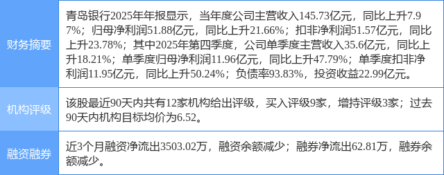 2026年1月29日,信达证券研究员张晓辉发布了对青岛银行的研报《青岛银行2025年业绩快报点评:规模、业绩、资产质量全维度向好》,该研报对青岛银行给出“买入”评级。证券之星数据中心根据近三年发布的研报数据计算,该研报作者对此股的盈利预测准确度为95.25%。