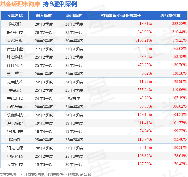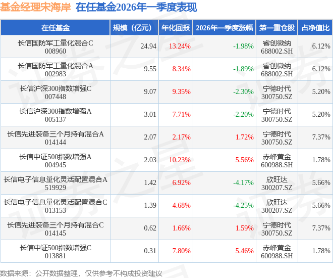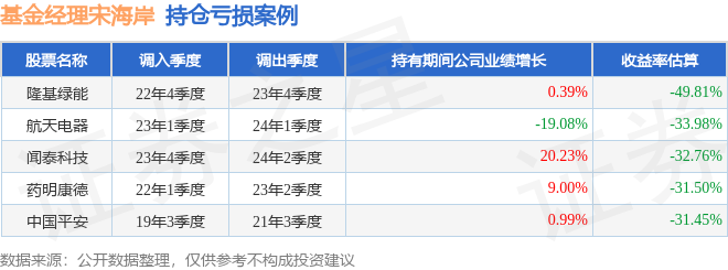 重仓股调仓示例详解:1、科沃斯(603486)翻倍案例:宋海岸管理的长信中证500指数增强A基金在20年3季度买入科沃斯,在持有1年又0个季度后在21年3季度卖出。持有期间的估算收益率为382.23%,持有期间科沃斯在2020年到2021年的年报归属净利润增幅达213.51%。2、华创阳安(600155)调仓案例:宋海岸管理的长信中证500指数增强A基金在18年4季度买入华创阳安,在持有2个季度后在19年2季度卖出。持有期间的估算收益率为99.33%,持有期间华创阳安在2018年到2019年的年报归属净利润增幅达74.24%。3、隆基绿能(601012)调仓案例:宋海岸管理的长信沪深300指数增强A基金在22年4季度买入隆基绿能,在持有1年又0个季度后在23年4季度卖出。持有期间的估算收益率为-49.81%,持有期间隆基绿能在2022年到2023年的年报营业总收入增幅达0.39%。