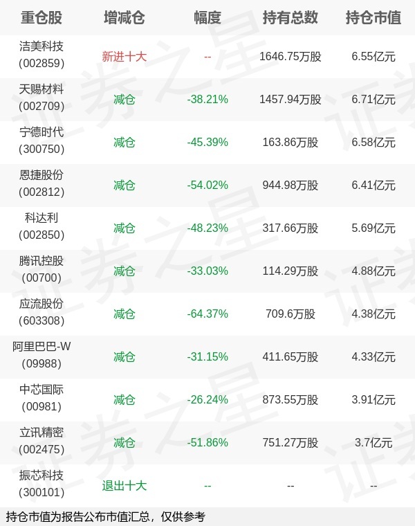 证券之星消息,4月22日泉果基金旗下赵诣管理的泉果旭源三年持有期混合型基金公布一季报,近1年净值增长率73.76%。与上一季度相比,该基金前十大重仓股新增洁美科技;其中天赐材料持仓占比9.69%,为该基金第一大重仓股;振芯科技等退出前十大重仓股;详细数据如下: