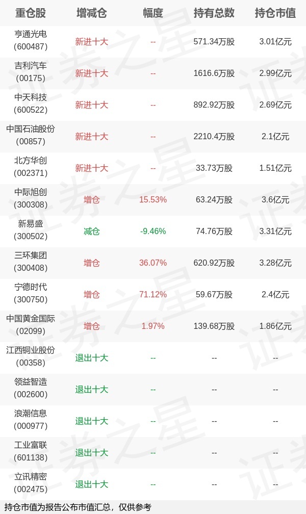 证券之星消息,4月22日易方达基金旗下祁禾管理的易方达高端制造混合型发起式基金公布一季报,近1年净值增长率144.1%。与上一季度相比,该基金前十大重仓股新增亨通光电,吉利汽车,中天科技,中国石油股份,北方华创;并对中际旭创增仓8.5万股,为该基金第一大重仓股;江西铜业股份,领益智造,浪潮信息,工业富联,立讯精密等退出前十大重仓股;详细数据如下: