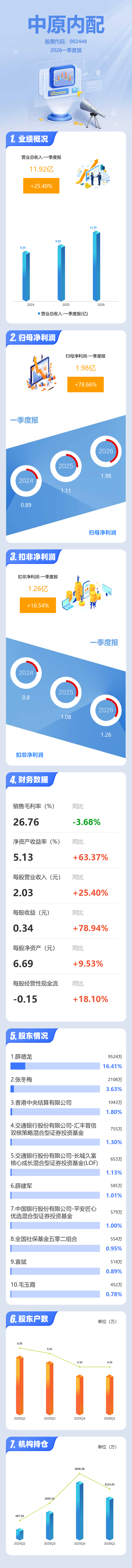 证券之星消息,中原内配2026年一季报显示,一季度公司主营收入11.92亿元,同比上升25.4%;归母净利润1.98亿元,同比上升78.66%;扣非净利润1.26亿元,同比上升16.55%;负债率35.04%,投资收益-2390.31万元,财务费用1120.01万元,毛利率26.76%。