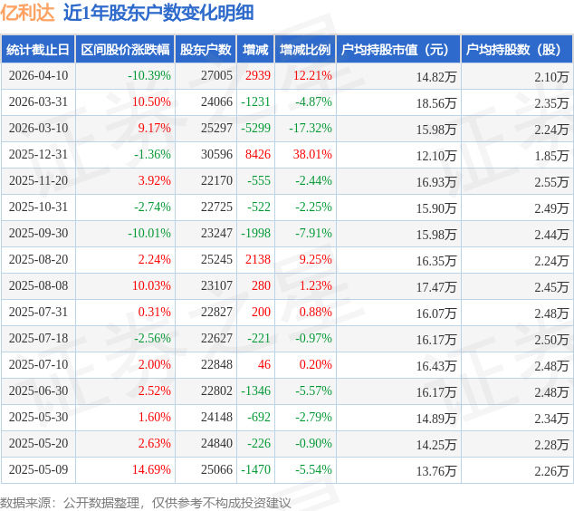 证券之星消息,近日亿利达披露,截至2026年4月10日公司股东户数为2.7万户,较3月31日增加2939.0户,增幅为12.21%。户均持股数量由上期的2.35万股减少至2.1万股,户均持股市值为14.82万元。