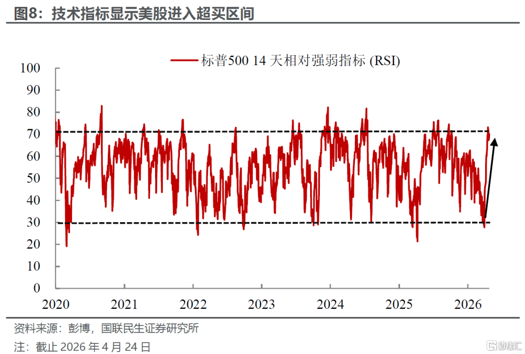 国联民生证券认为,短期空头被动回补带来的阶段性行情支撑因素已逐步消退。单从技术层面来看,近期标普500 RSI指标快速上行,已然步入超买区间,技术性修正需求持续累积。伴随空头回补红利逐步弱化,若后续缺少盈利、政策等新增核心利好接续催化,美股单边行情大概率告一段落,后续或将转入区间震荡,阶段性小幅调整风险也有所抬升。