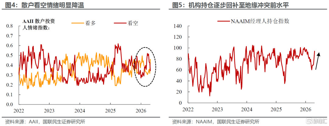其次,整体市场仓位与情绪已基本回归中东地缘冲突开始前的常态水平。AAII散户看空情绪较3月下旬悲观高点已显著下行,基本回落至冲突发酵前区间;同时,NAAIM基金经理持仓也快速回升至94%。市场交易心态从前期恐慌性止损回补,逐步转向中性谨慎的观望状态。