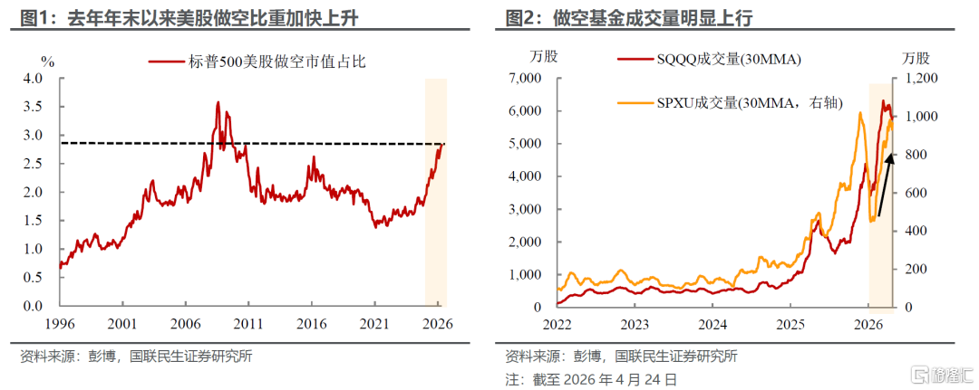 实际上,自去年年末起,受前期科技板块累计涨幅偏高、降息预期反复摇摆扰动,美股空头情绪便持续发酵;叠加伊朗地缘局势持续紧张,看空情绪进一步加速升温。截至3月末,美股做空市值占比一度攀升至2.8%,仅次于2008年;与此同时,SQQQ、SPXU等指数做空类ETF交易规模显著放量,充分反映出资金对美股后续上行空间的质疑。