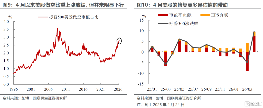 美伊释放谈判信号以来,美股快速修复之前跌幅并创下历史新高,无论是基于分子端还是分母端,在这个位置相较下跌前进一步增配美股似乎都没有充足的证据,我们认为创新高的主要推手也许是大量空头的回补。