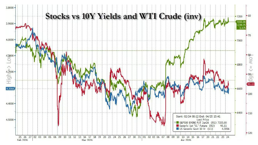 高盛Delta One交易台指出,尽管空头回补带来一片亢奋,霍尔木兹海峡的局势却丝毫未有改善。油价与美债收益率依然高企,美股已与几乎所有宏观指标全面脱钩。