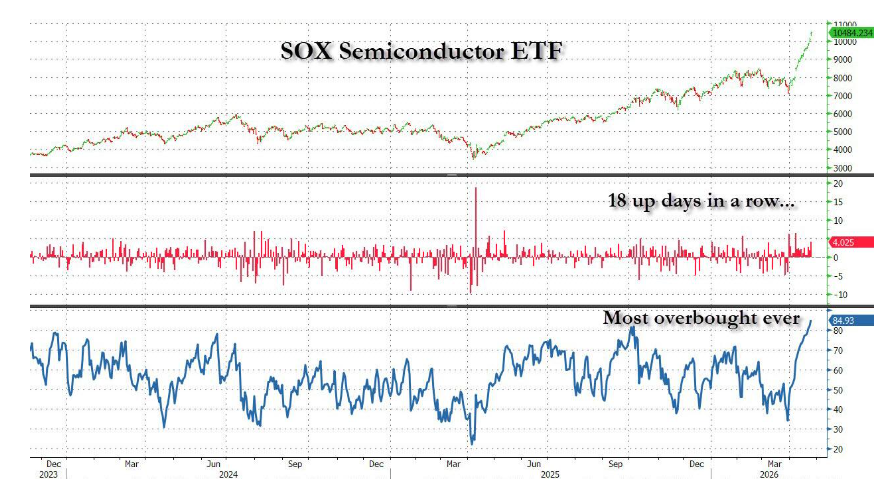 近日美国股市频繁创下历史新高,费城半导体ETF迎来史无前例的18连涨,高盛Delta One交易台指出,尽管空头回补带来一片亢奋,霍尔木兹海峡的局势却丝毫未有改善。油价与美债收益率依然高企,美股已与几乎所有宏观指标全面脱钩。
