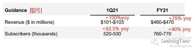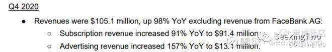 最新公布的20Q4收入同比增长98%,其中订阅收入同比增长91%,广告收入翻倍以上增长(随着广告收入贡献越来越大的收入占比,将成为另一个增长点),Q4的订阅数增速237%远大于全年增速73%。