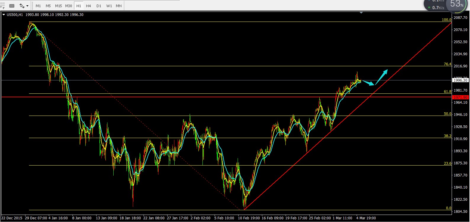 标普500期货电子盘60分钟图:预计到达趋势线附近后继续上行。关注能源小企业公司的股价,同时关注标普大盘股走势。