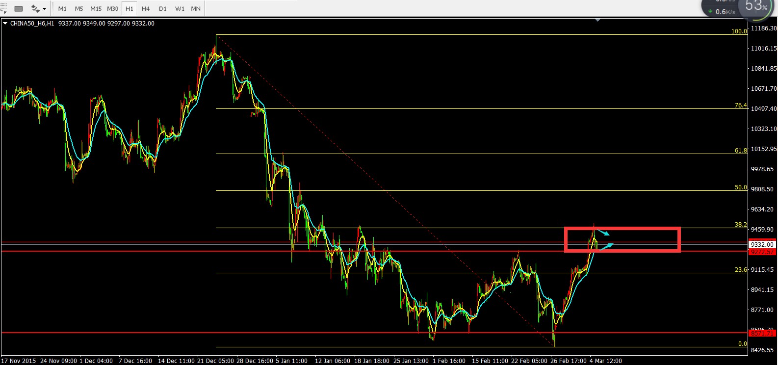 国内股指方面,由于两会期间没有提及注册制,使得股票的供给一时不会大量增加,沪指高开并最后收涨。由于上周五上证50强行护盘,所以上周五沪指在收盘时强行稳在平盘之上,而深成指、中小板、创业板均收跌,独上证50上涨3.36%。今日两市均有所上涨,自然上周五护盘的上证50指数会有所回落,我们在富时A50的期货走势上可以看到从上午开盘开始,富时A50就不断走低,但是在前方支撑位上获得支撑。途中红色矩形框是近期可能的震荡范围。震荡不是很适合CHAU/CHAD。