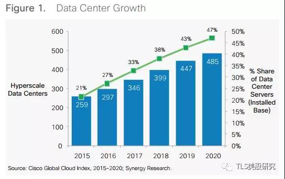 根据思科的数据,超规模数据中心数量不但在逐年增多,超规模数据中心占全部数据中心的服务器总量也将在2020年达到接近47%。
