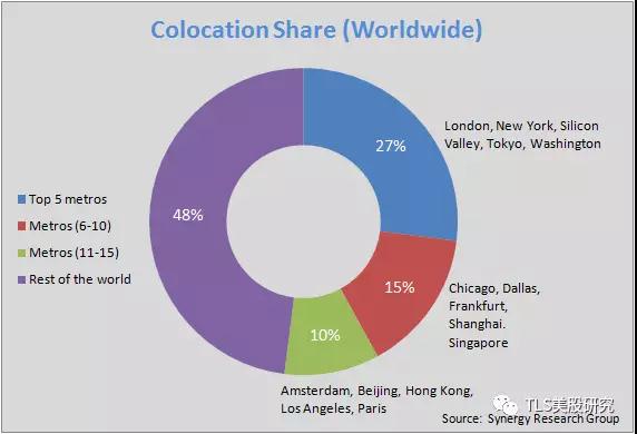 国际大都市和通信网络中枢的数据中心地皮相对稀缺。如下图所示,纽约、伦敦、硅谷、东京和华盛顿占了全球colocation市场营收的27%,而前十五大城市占了全球colocation市场的一半以上。