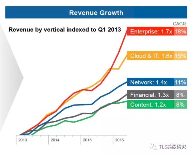 根据Colocation市场的龙头Equinix所披露,在其五大客户群中,企业和云计算公司(提供基于云服务的软件服务,SaaS)自2013年以来是增速最快的两大客户群。