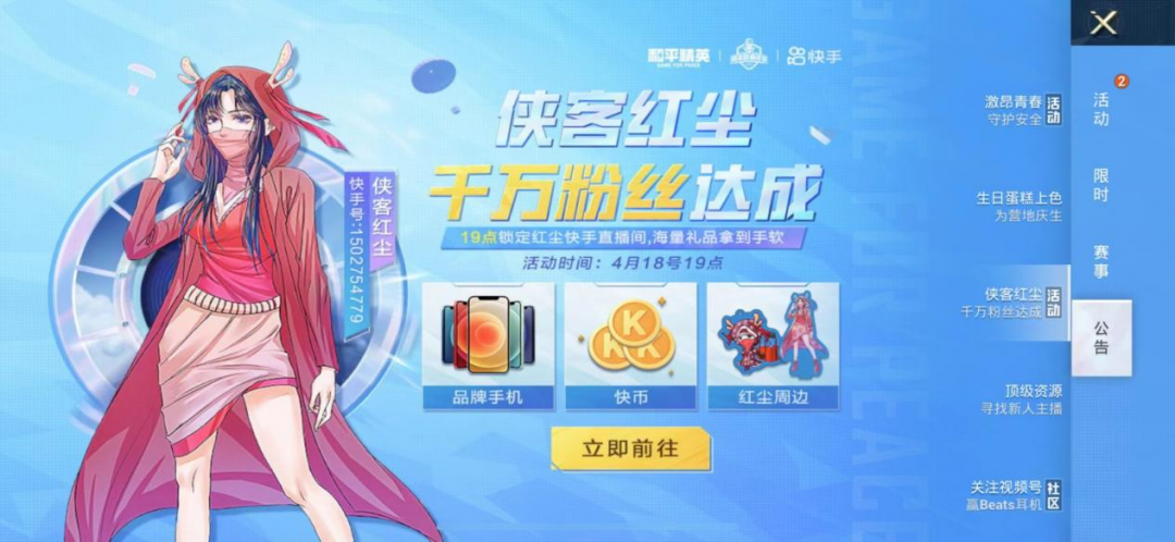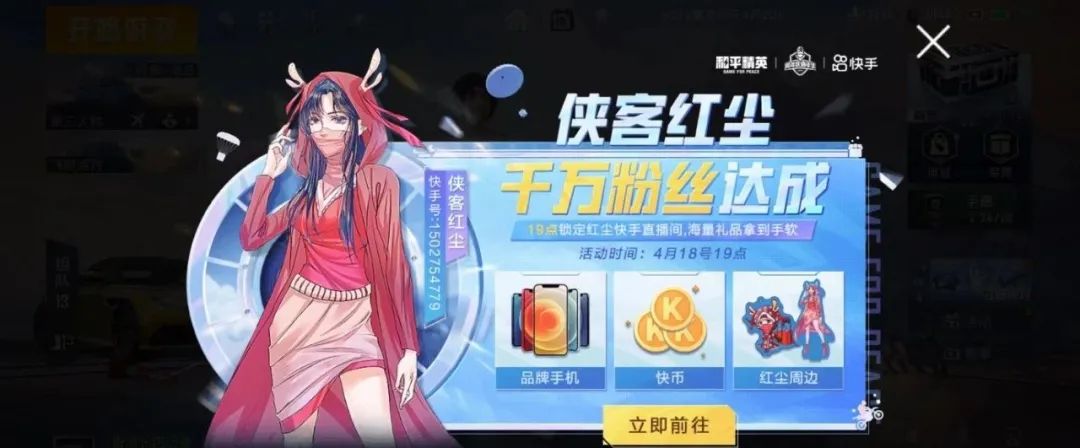 而值得注意的是,在快手上已有不少《和平精英》头部主播的前提下,侠客红尘作为外来主播,依然能在短时间里在快手站稳脚跟,并迅速成长为快手上《和平精英》品类粉丝破千万的大主播。