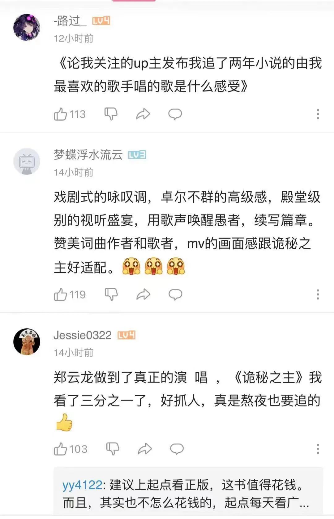 从评论区的粉丝反馈来看,几乎满屏的“三厨狂喜”“梦幻联动”“次元壁破了”的声音。而还未读过原著的听众也能从中感受到粉丝传递的热烈感情和《诡秘之主》的魅力,从而让人对小说产生浓厚的兴趣。