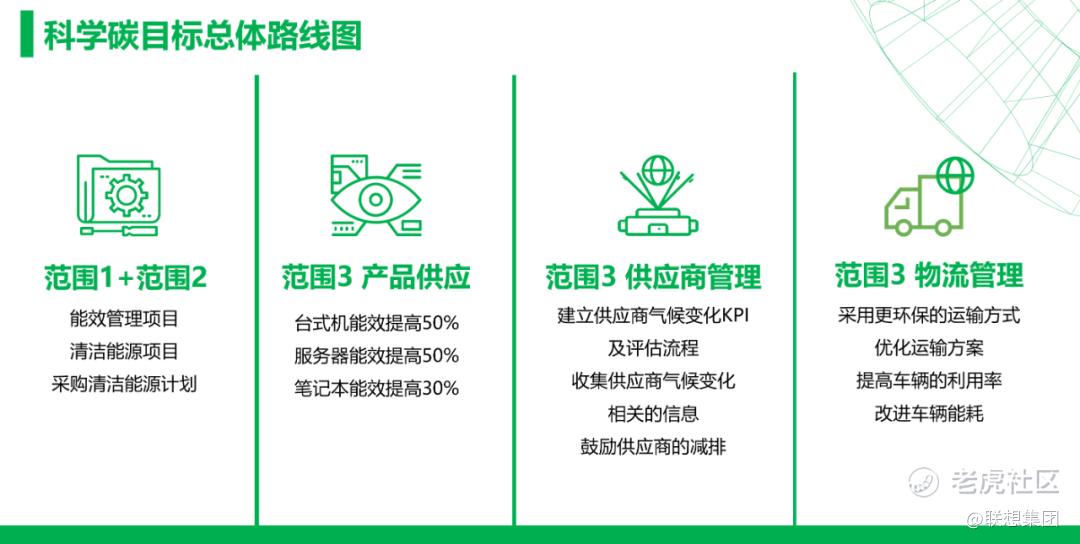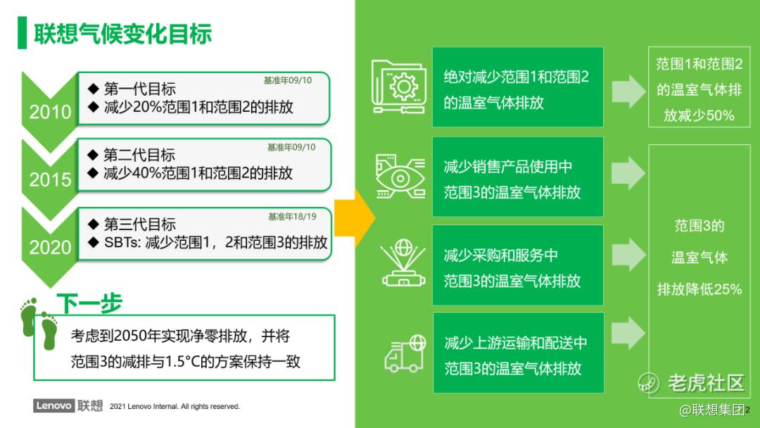 为实现这个目标,我们制定了碳减排总体路线图,大家可以看到,联想在加大自身运营减排的同时,还在积极通过数字化、智能化打造绿色产品设计、绿色制造、绿色物流、绿色供应链体系,从而引导和带动整个产业链上下游共同实现低碳转型。目前我们正在积极评估,力争2050年达成温室气体净零排放的可能性。