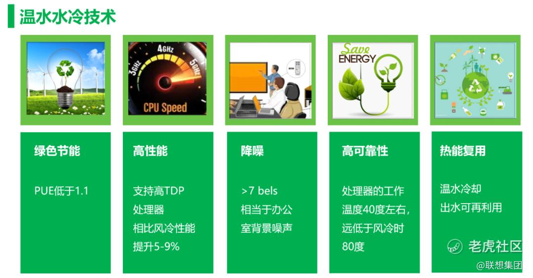 大家都知道,这些年来数据中心不断扩大,用能需求猛增。数据中心的能耗主要在IT设备和空调制冷设备上,据统计空调制冷设备的能耗,占整个数据机房用电的40%。联想自主研发的温水水冷技术,目前已经成为降低数据中心能耗的最佳方案之一。温水水冷技术通过减少对空调和散热器的需求,可节约40%以上的能耗成本,热量还可以循环利用。与普通的风冷系统PUE 2.0相比,我们可以做到1.1以内,也就是说1度电用于计算,只要0.1度电用于散热。能源再利用效率ERE更是达到了业界领先,融合科学计算和智能计算,开启了高性能计算的绿色智能化新时代。