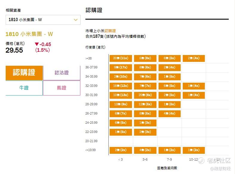 小米上日收市報29.55元,跌0.45元,曾創3個月高 30.45元。市場上合共有187只小米認購證,行使價在30~31.99水平的認購證合共有33只,產品杠杆從4倍到13倍不等。
