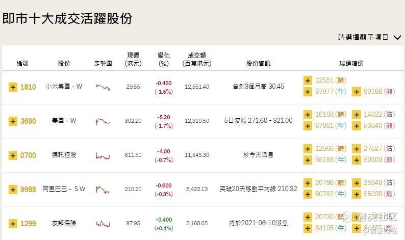 至於即市十大成交活躍股份當中,$小米集团-W(01810)$ 、$美团-W(03690)$ 、$腾讯控股(00700)$ 、阿里巴巴(9988)、友邦保險(1299)為其中5只成交活躍股份。
