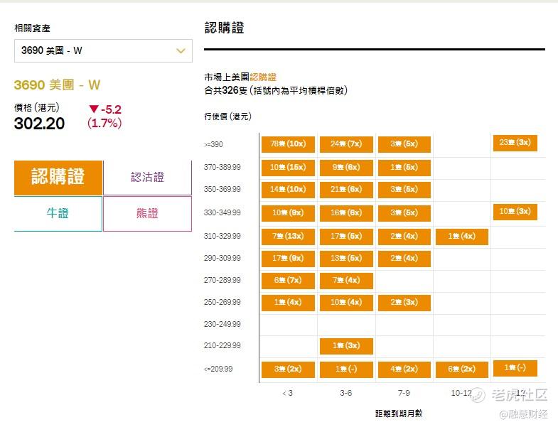 美團上日收市報302.2元,跌5.2元,5日波幅 271.60 - 321元。市場上合共有326只美團認購證,行使價在310~329.99水平的認購證有27只,產品杠杆4-13倍。